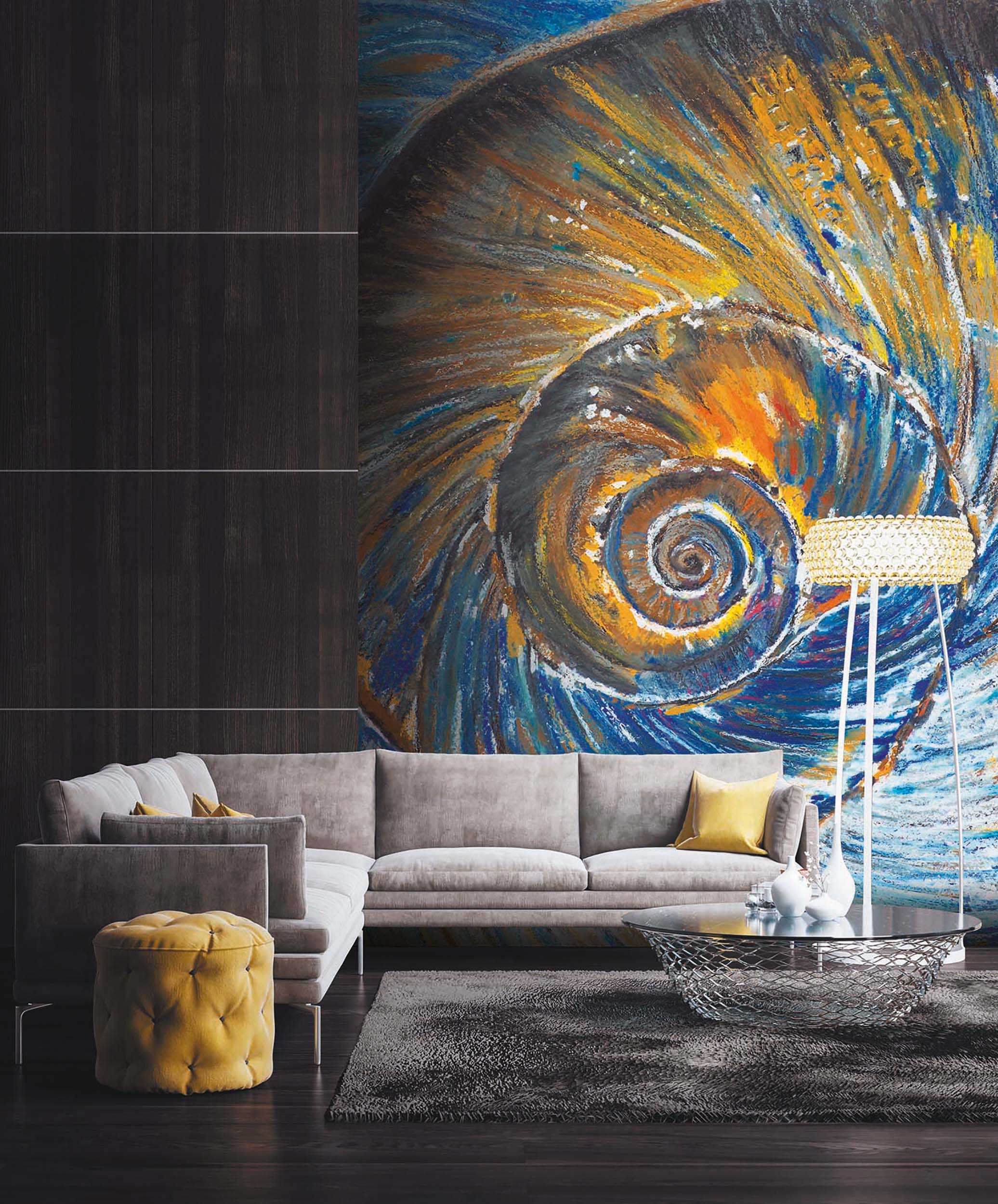 Objective | Timeless textured design for digital printing Idea | My pleasure is to rediscover the most innocuous things: here a snail. It is a small viscous being yet its carapace is worthy of the most beautiful sculptures! Thanks to chalks, I tried to relay my wonder in front of this shell playing with nuances, asperities, etc.